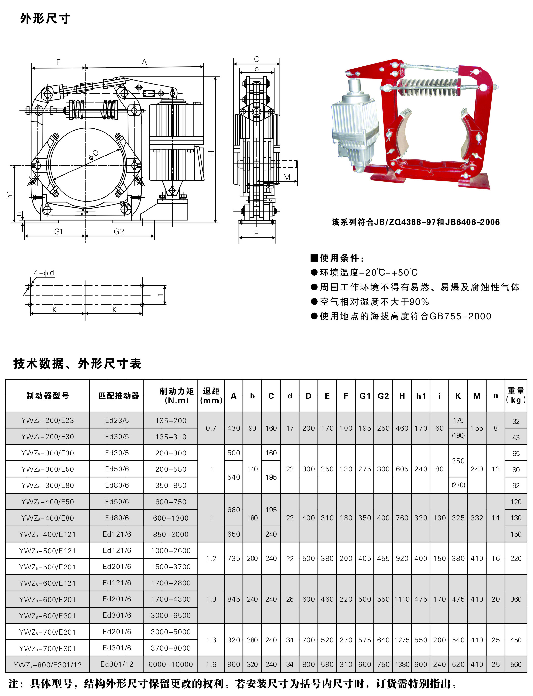 制動器安裝尺寸和制動力矩參數(shù):JH/ZQ4388-97標準,技術要求符合JB/T6406-2006標準。