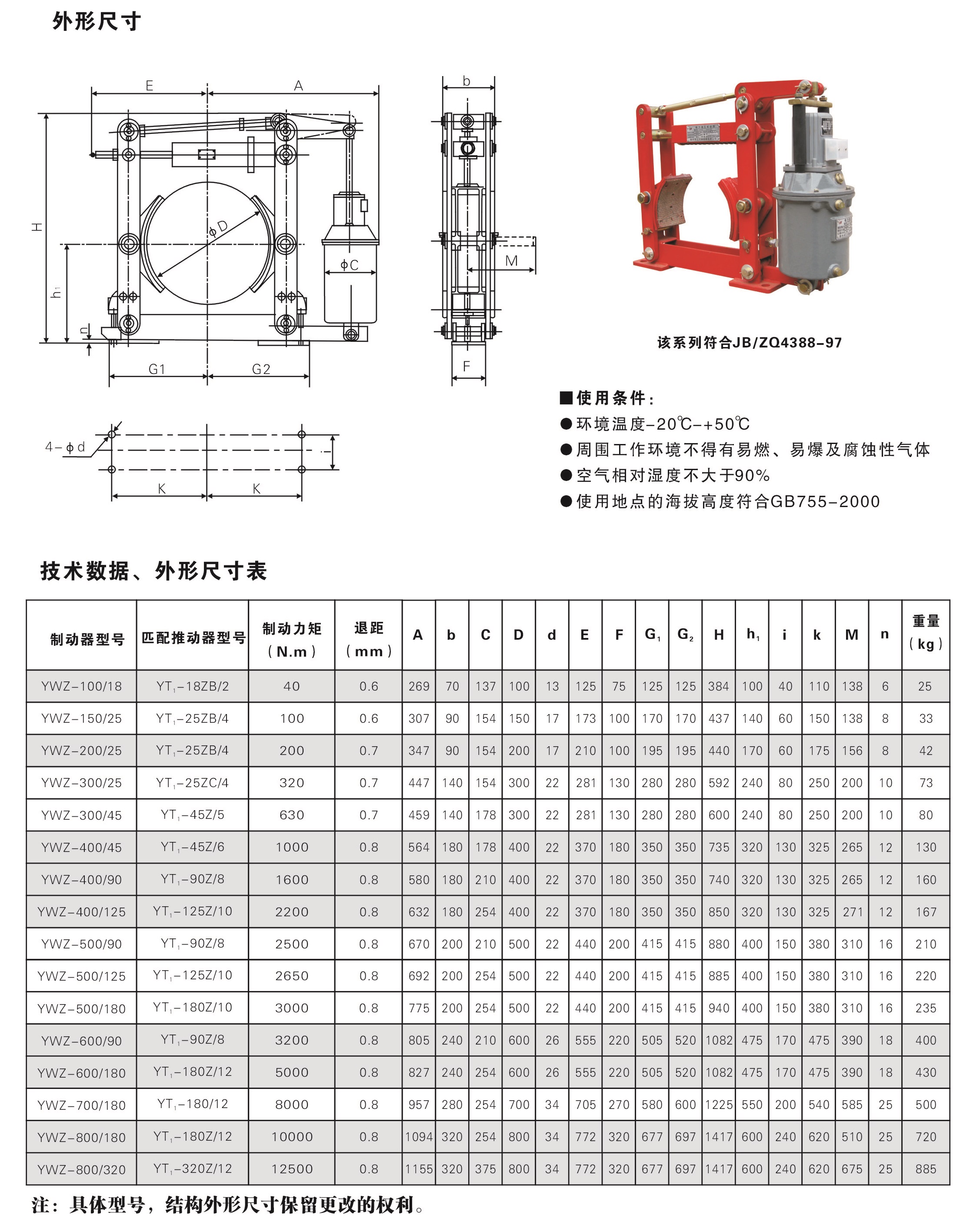 YWZ系列電力液壓塊式制動器主要用于起重、運輸、冶金、礦山、港口、建筑機械驅(qū)動裝置的機械制動,具有制動平穩(wěn),安全可靠、維修方便、耗電少、壽命長、無噪音等優(yōu)點。
