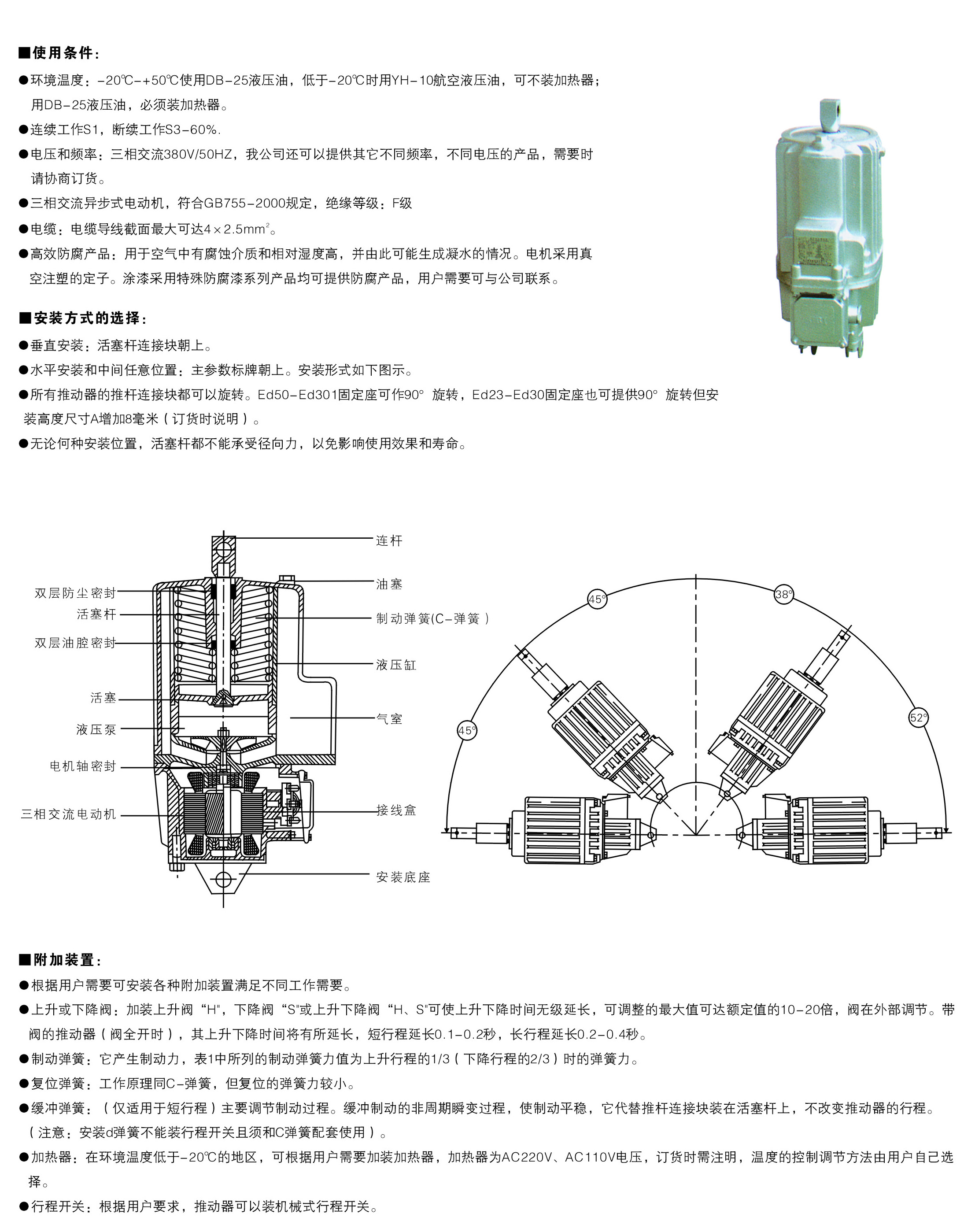 油缸殼體在一側(cè)設(shè)有平衡氣室,可使推動(dòng)器在0-180°任何方向安裝,從而擴(kuò)大其使用范圍;
