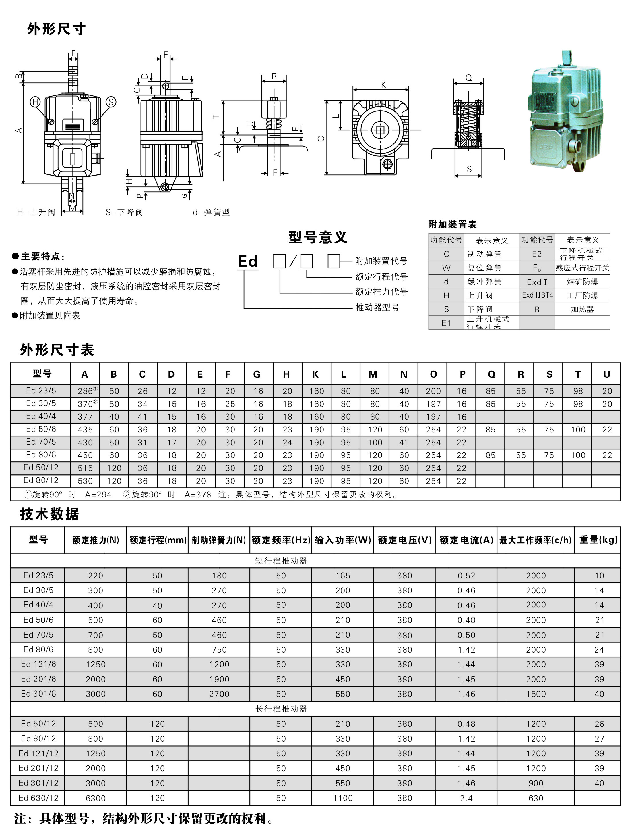Ed系列電力液壓推動(dòng)器是一種集電機(jī),離心泵,油缸為一體的,結(jié)構(gòu)非常緊湊的驅(qū)動(dòng)控制裝置,被廣泛用作各種塊式制動(dòng)器和盤式制動(dòng)器的驅(qū)動(dòng)裝置,還可用于各種工業(yè)閥門,閘門,定向擺動(dòng)和轉(zhuǎn)動(dòng)(<90°)裝置(機(jī)構(gòu))及夾緊裝置的驅(qū)動(dòng)控制。